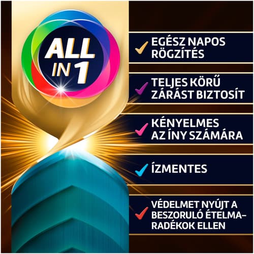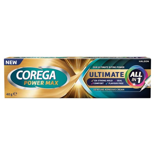 A Corega Ultimate All in One műfogsorrögzítő krém biztonságos és kényelmes használatot biztosít egész nap.