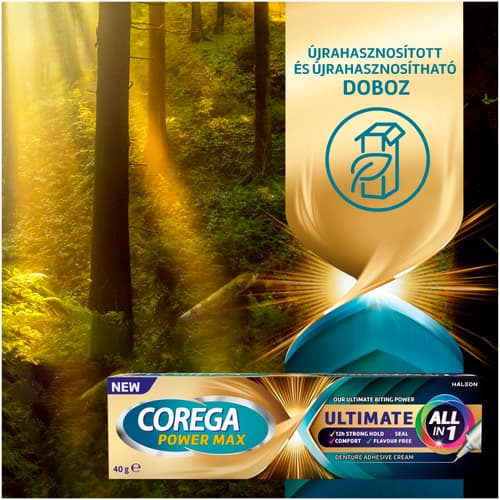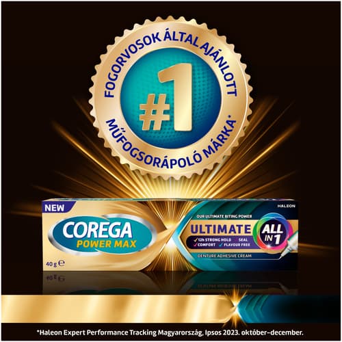 Corega Ultimate All in One műfogsorrögzítő krém erős tartást biztosít, hosszan tartó frissességet és védelmet nyújt a lepedék ellen.