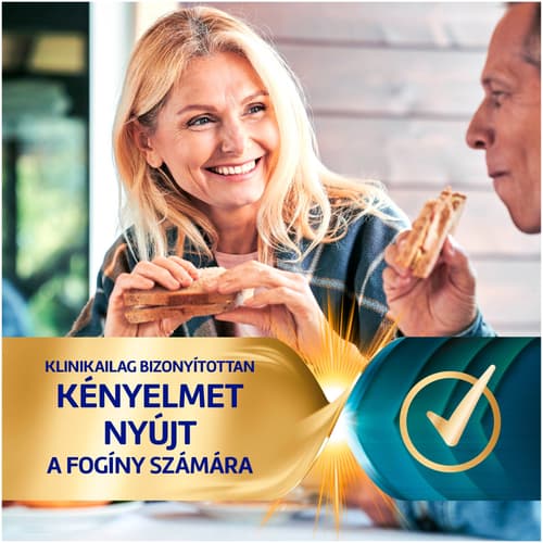 - Tartsa a műfogsort a helyén néhány másodpercig, hogy a krém megköthessen.
