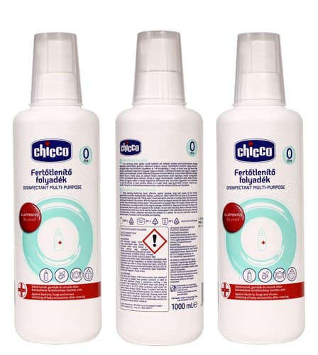 Chicco Disinfectant Liquid removes dangerous and infectious bacteria, viruses, fungi (e.g. mold) from the surface and interior of objects with complete perfection. It is recommended for microbiological disinfection of all objects that come into contact with infants and small children, people with weak immune systems. Mixed with water in the appropriate ratio and soaked in the aqueous solution for an appropriate time, it kills 100% of all bacteria, fungi and viruses that get on the objects.