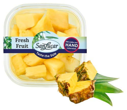SanLucar Sliced Pineapple is a premium quality, freshly sliced pineapple, ready for immediate consumption. SanLucar offers carefully selected, ripe pineapples that are sweet and juicy to provide the best taste experience. The fruit undergoes careful processing to preserve its natural flavour and nutritional content. Ideal as a healthy snack, an addition to breakfasts, or even as an ingredient for special desserts. Thanks to its practical, pre-prepared form, you can save time while enjoying tropical flavours without compromise. SanLucar products are known not only for their excellent quality but also for their sustainable and ethical production, making sliced pineapple not only delicious but also a responsible choice.
