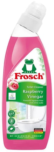A Frosch málnaecetes WC tisztító gél Németországból hatékonyan távolítja el a szennyeződéseket, vízkő- és vizeletlerakódásokat a WC felületéről, még a perem alól is. Málnaecet tartalmának köszönhetően a legmakacsabb szennyeződéseket és a kellemetlen szagokat is megszünteti, ragyogóan tiszta felületet és friss málna illatot biztosít. Környezetbarát választás a tiszta otthonért.