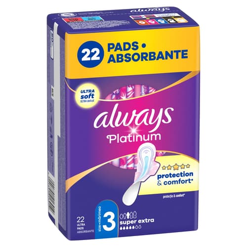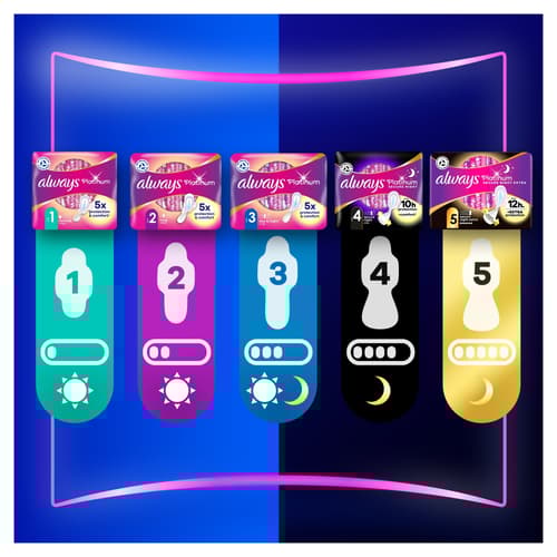 Always Platinum sanitary towels with their "Zero Feel" design ensure that you can get through your day without a care in the world. These exceptional sanitary towels offer five times the comfort thanks to their silky soft wings, 3D LeakGuard barriers, 1000 soft micro-cushions, Soft&Fit design and OdourLock odour neutralising technology. The size 3 Always Platinum Night towels with wings are recommended for night-time use for medium to heavy flow. Try Always Platinum Secure Night sanitary towels in size 4, the Always Platinum towel that offers the very best night-time protection.