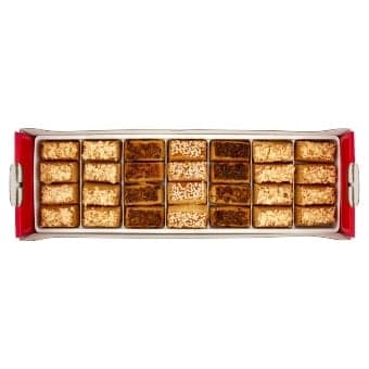 Benei rectangular salty pastries sprinkled with grated cheese, caraway seeds and sesame seeds, 28 pieces in a box. Ideal for snacking, especially when there is no time to bake for guests.