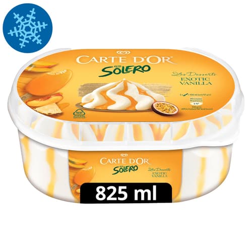 Vanilla flavoured ice cream with exotic fruit sorbet (11%) topped with exotic fruit sauce (10%)