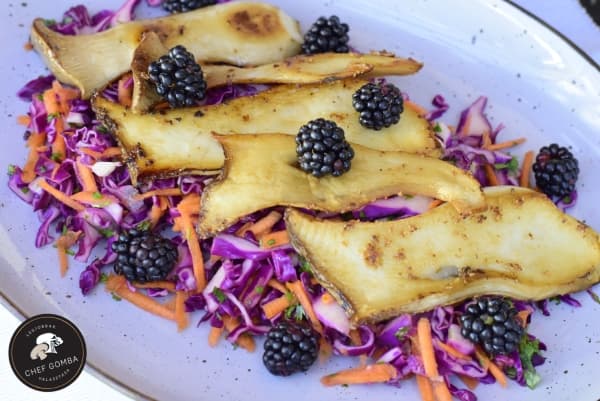 Place the grilled mushroom slices on the salad, sprinkle with blackberries, and serve.