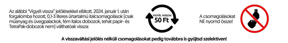 - 2025. június közepétől minden rendeléshez automatikusan csatolunk 1 db zsákot – a rendelt termékek között található meg. Bármikor kérhetsz a futártól új zsákot a következő (vagy akár az éppen aktuális) rendelésedhez. A rendelés leadásakor a megjegyzés mezőben is köszönjük, ha jelzed az üvegvisszaváltási szándékod a futár felé.