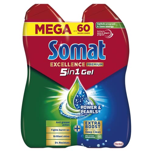 Somat Excellence Duo Gél - a legjobb Somat mosogatógél formulánk, mely hatékonyan tisztít és ragyogó edényeket biztosít, alacsony hőmérsékletű ECO vagy alacsony hőmérsékletű rövid mosogatási programok használata esetén is, melyek során akár 20% energiát is megtakaríthat. Ragyogást és védelmet biztosít a kemény víz okozta foltoktól. Az egyedülálló kétkamrás flakon segítségével a Somat két hatékony formulát egyesít az erőteljes zsíroldóhatás, valamint az odaégett szennyeződések eltávolítása érdekében.