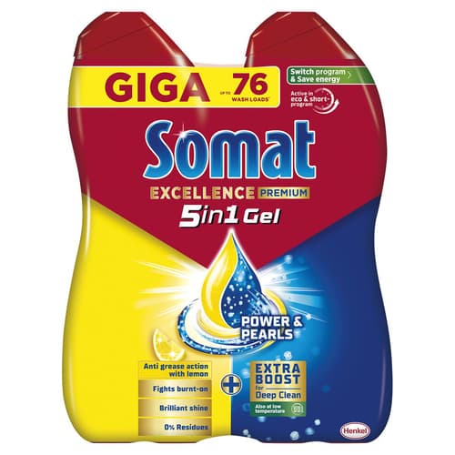 Somat Excellence Duo Gél - a legjobb Somat mosogatógél formulánk, mely hatékonyan tisztít és ragyogó edényeket biztosít, alacsony hőmérsékletű ECO vagy alacsony hőmérsékletű rövid mosogatási programok használata esetén is, melyek során akár 20% energiát is megtakaríthat. Ragyogást és védelmet biztosít a kemény víz okozta foltoktól. Az egyedülálló kétkamrás flakon segítségével a Somat két hatékony formulát egyesít az erőteljes zsíroldóhatás, valamint az odaégett szennyeződések eltávolítása érdekében.