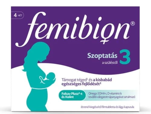 Femibion 3 filmtabletta szoptató anyukáknak. Ez a vitamin komplex kifejezetten a szoptatás időszakára készült, támogatva a baba normális agy- és szemfejlődését. Kolint, kalciumot, luteint, DHA-t és számos vitamint tartalmaz. A 4 heti adagot tartalmazó, 56 darabos kiszerelés segít biztosítani a szükséges tápanyagokat ebben a fontos időszakban.