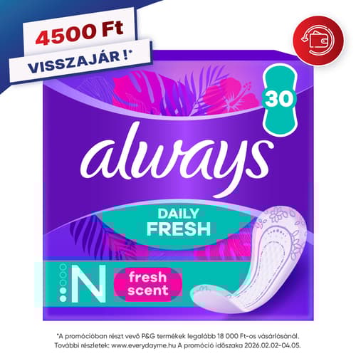 Az Always Dailies Normal Fresh & Protect Friss illattal tisztasági betéttel egész nap olyan frissnek és üdének érezheted magad, akár egy százszorszép! Különleges kialakításának köszönhetően kényelmet és védelmet nyújt, így minden nap számíthatsz rá, viselése pedig szinte észrevétlen marad. Ideális hüvelyfolyás esetén, vagy extra védelemként rendszertelen vérzéskor, illetve enyhe menstruációhoz.
