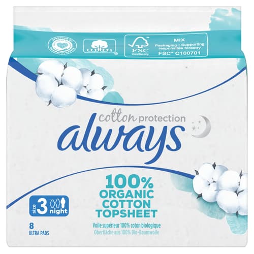 Az Always Cotton Protection Ultra egészségügyi betét a 100%-ban organikus pamut fedőrétegnek és újrahasznosítható papírcsomagolásának köszönhetően gondoskodik az Ön és környezete védelméről. A betét illatanyagoktól, színezékektől és klórtartalmú fehérítőtől mentes. Az SHA dermatológiai szövetség bőrgyógyászainak jóváhagyásával és a Cotton Inc. nonprofit szervezet által tanúsítva. A magban található nedvességmegkötő zselé a megbízható Always-védelem érzését nyújtja.Az Always Cotton Protection Night betét használatát közepes erősségű menzesz esetén L-es, erős menzesz esetén pedig M-es vagy L-es méretű fehérneműt viselő hölgyeknek ajánljuk. Always termékeinkkel kapcsolatos további részletekért látogasson el az Always weboldalára.