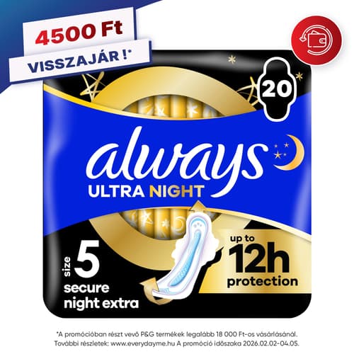 Ha zavartalan éjszakai alvásra vágysz, ne érd be kevesebbel az akár 12 órán át tartó védelemnél: Az 5-ös méretű ALWAYS Ultra Secure Night Extra szárnyas egészségügyi betét nedvszívó és gyengéd fedőréteggel, valamint 3 védelemről gondoskodó termékjellemzővel rendelkezik, hogy ne kelljen az éjszaka közepén felkelned a szivárgás ellenőrzése vagy betétcsere miatt. A 9%-kal nagyobb első és 85%-kal nagyobb hátsó rész (az 1-es méretű Always Ultra Normal betétekhez képest), valamint a LeakGuard technológia gondoskodnak a teljes körű védelemről a szivárgás megelőzése érdekében a menzesz éjszakáin. Az Always Ultra egészségügyi betétek a Skin Health Alliance bőrgyógyászati jóváhagyásával rendelkeznek.