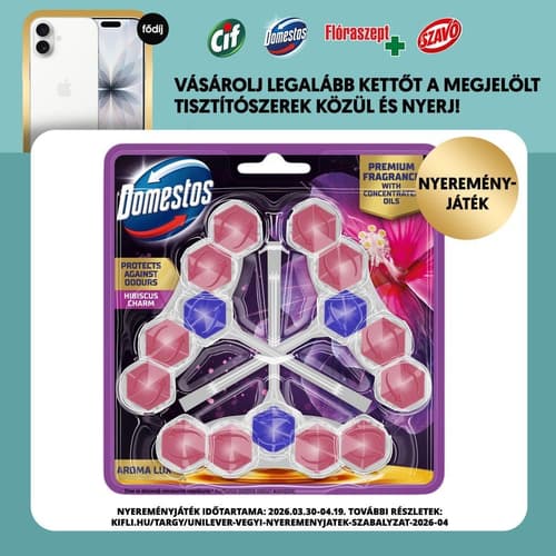 Domestos Aroma Lux WC illatosító blokk Hibiscus Charm illattal, koncentrált illóolajokkal. Ez az EU-ból származó, 3 darabos kiszerelésű blokk hosszan tartó, kellemes illatot biztosít öblítések között is. Higiéniát, erős habzást és csillogó tisztaságot garantál, miközben megakadályozza a vízkő lerakódását. Egyszerűen akaszd a WC peremére, és élvezd a frissességet!