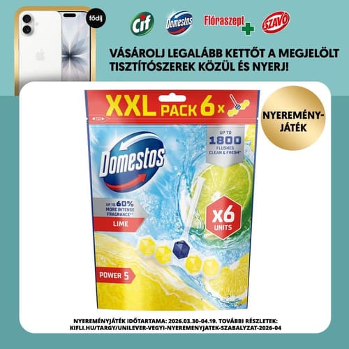 EU,A Domestos Power5 Lime WC-blokkok segítenek a szennyeződések eltávolításában, a vízkő elleni küzdelemben, és mindennapos frissességet biztosítanak.