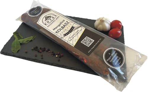 A Royal Gourmeat mangalica csemege kolbász a prémium húskészítmények kedvelőinek igazi ínycsiklandó különlegessége. Az autentikus magyar receptúra alapján készült kolbász válogatott mangalica sertéshúsból készül, amely különleges, gazdag ízét a hagyományos fűszerek és füstölési technikák egészítik ki.