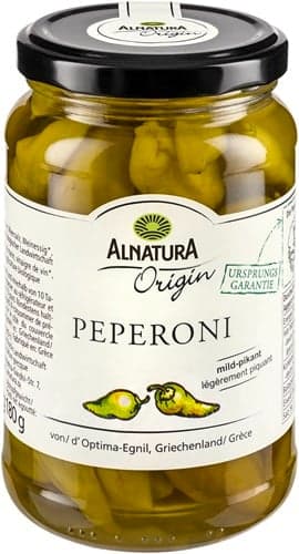 Az Alnatura enyhén pikáns Bio Origin pepperoni kézzel szedett és sós lében pácolt zöldpaprika, származási garanciával: Az Alnatura Origin paprikák a görögországi Peloponnészosz-félszigeten található Olympia városában található Optima-Egnilből származnak. Enyhe, fűszeres ízükkel ideálisak bármilyen előételhez, és mediterrán ételek összetevőjeként is alkalmasak.
