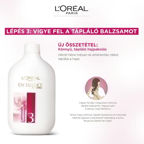 A L'Oréal Paris Excellence most egy hialuronsavval gazdagított hármas ápoló hatású hajfestési rituálét mutat be, amely gondoskodik a hajszínről, gyengéd a fejbőrhöz és ápolja a hajat. Az új, ápoló sampon kíméletes pH-val a hajat puhává, fényessé és természetes színűvé varázsolja. Akár 100%-os őszhajfedés.