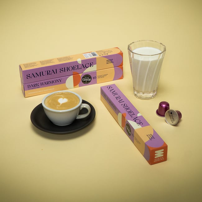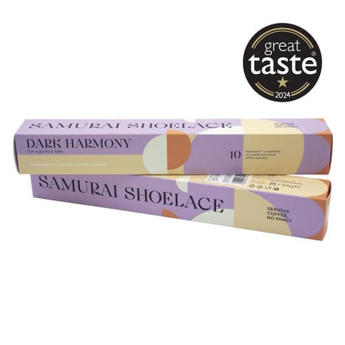 A Dark Harmony, a Samurai Shoelace "Serious Coffee" sorozatának legintenzívebb pörkölésű tagja. Kimondottan csokis, pörkölt-mandulás ízvilág jellemzi, elsősorban tejes italokhoz ajánlott. (Persze akik az intenzív, sokáig érződő ízű presszókat szeretik, nekik is jó választás lesz!). Koffeintartalma nem magasabb, mint a többi kapszulának, mégis a jellegzetesen erős íze miatt, igazi reggeli beindító ital lehet! A Dark Harmony kávékapszula a 2024-es Great Taste Awards-on csillagot nyert!