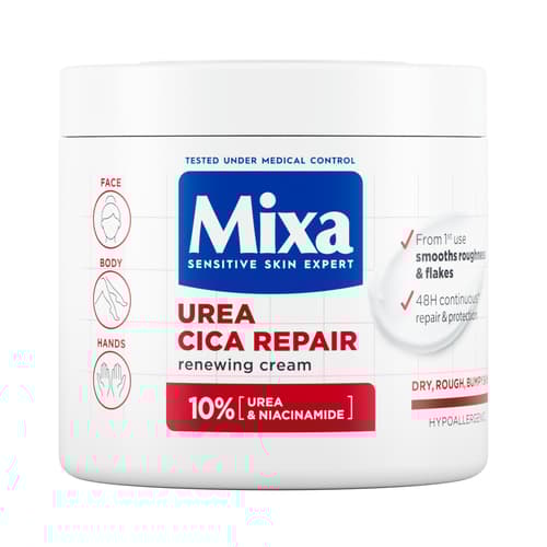 Mixa regeneráló testápoló száraz, durva bőrre kíméletes formulával ureával és glicinnel gazdagítva érzékeny bőrre is. Gazdag bőrnyugtató textúrája akár 48 órás regenerálást és védelmet nyújt.