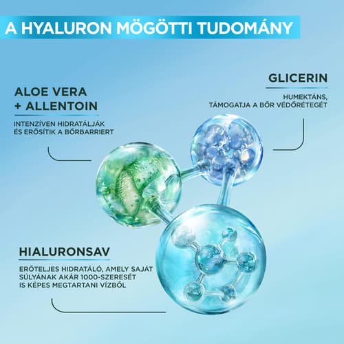 Hyaluron Barrier Repair hidratáló gél 5% [GLICERIN] és [ALLANTOIN + ALOE VERA + HIALURONSAV] erejével gazdagított, friss és gyorsan beszívódó formulával az akár 48 órás hidratálásért*. Segít nedvességgel feltölteni a bőrt és regenerálni a bőr védőrétegért.