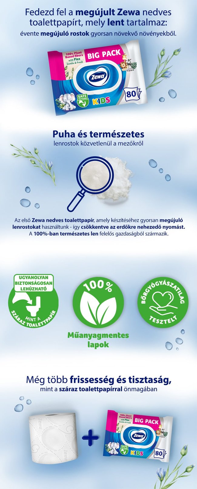 Fedezd fel a természet erejét az új Zewa nedves toalettpapírokkal! Bemutatjuk az első olyan terméket, amely természetes len rostot tartalmaz, melyet évente megújuló és gyorsan növekvő növényekből nyerünk ki. A rostok beszerzése fenntartható módon kezelt mezőgazdasági területekről származik, így csökkentve az erdők használatának szükségességét.