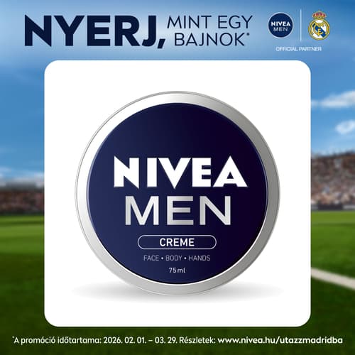 A férfi bőr igényeinek megfelelően kialakított, arcra, testre és kézre is használható univerzális krém E-vitaminnal gazdagított formulája hosszan tartó hidratálást biztosít. Könnyen beszívódik, nem hagy maga után zsíros bőrérzetet, kellemes, férfias illatával pedig az érzékeket is felfrissíti. Bőrbarát hatása bőrgyógyászatilag igazolt. A termék elérhető 150ml és 30ml kiszerelésekben is: NIVEA MEN Creme 75 ml.