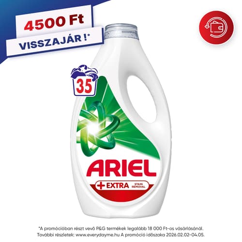 A Whirlpool, Electrolux és Beko mosógépgyártók által is ajánlott Ariel bemutatja az Ariel + Extra folteltávolító hatású folyékony mosószert, amely az Ariel minden eddiginél kiválóbb folyékony mosószere. Az Ariel páratlan tisztítóhatását nyújtja, miközben felveszi a küzdelmet a 7 napja beszáradt foltokkal és a kellemetlen szagokkal is. Az Ariel + Extra tisztítóhatású folyékony mosószer alacsonyabb mosási hőfokon is patyolattisztára mossa a ruhákat. Az Ariel + Extra tisztítóhatású folyékony mosószer a foltok előkezelésére is alkalmas; ehhez használja a zöld kupakot, majd helyezze a ruhákat a mosógépbe. A legkiválóbb eredmény érdekében a mosószert tartalmazó adagolókupakot helyezze a mosógép dobjába. Környezetvédelmi okokból nem minden flakont látunk el mérőkupakkal, azonban a kupak ingyenesen igényelhető az ariel.info webhelyen.