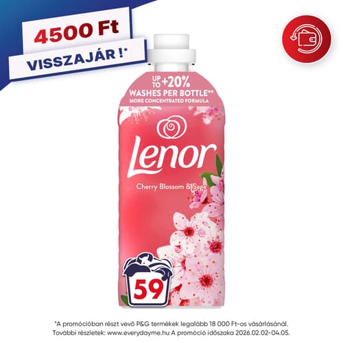 A Lenor Cherry Blossom & Sage textilöblítő 3x tovább tartó illattal (a Lenor Sensitive illatához képest) gondoskodik egész napon át a pihentető pillanatok élményéről. Illatanyaga egy csipetnyi illóolajat tartalmaz. Élje át a belső megnyugvás érzését. A cseresznyevirág és a rózsavíz kifinomult jegyei a boldogító békesség érzését keltik.