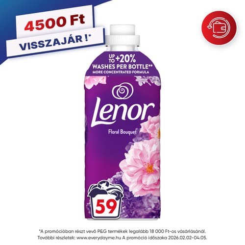 A Lenor Floral Bouquet textilöblítő 3x tovább tartó illattal (a Lenor Sensitive illatához képest) gondoskodik egész napon át a pihentető pillanatok élményéről. Illatanyaga egy csipetnyi illóolajat tartalmaz. Élvezze az élet örömeit. A csábító frézia virágos jegyei a sáfrány keleti fűszerességével a pillanatok teljes átélésére ösztönöznek. Próbálja ki a hozzá illő Lenor parfümgyöngyökkel együtt az ellenállhatatlan puhaság és frissesség érdekében.