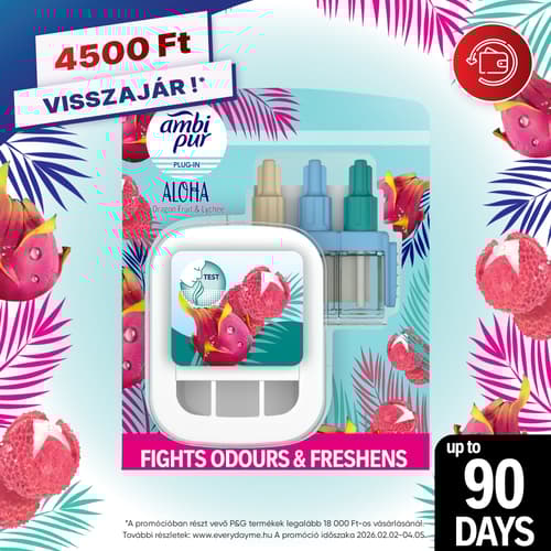 Az Ambi Pur 3Volution Aloha folyamatosan szünteti meg a kellemetlen szagokat és váltogatja a 3 egymást kiegészítő illatot, így a frissesség mindig érezhető. Akár 90 napon át tart (alacsony fokozaton, napi 12 órás használat esetén). Fedezze fel a kettős hatású Aloha szépségét (az alaptermékekhez képest): Messzebbről érezhető, intenzív illat, amely betölti a helyiséget. Merüljön el a Dragon Fruit & Lychee vibráló esszenciájában, ahol a levegő a trópusi gyümölcsök szimfóniájával táncol. A sárkánygyümölcs kezdeti kitörése átadja helyét az almavirágok, a frézia és a jázmin buja szívének, amely egy csokor piros bogyós gyümölcsökkel fonódik össze. Ahogy az illat kibontakozik, az elbűvölő pézsma és málna elidőzik, és a napsütötte nyári napokat idéző édes ölelésbe vonja, megidézve a paradicsom szellemét. Engedje, hogy körbeölelje érzékeit a megnyugvás tiszta és gyengéd illata! Az általános illatpárologtató készülékek esetében orrunk gyorsan hozzászokik az illatokhoz, melyeket egy idő után már nem érzünk. Az Ambi Pur 3Volution folyamatosan megújuló frissességet kínál, miközben 45 percenként automatikusan váltogatja a 3 egymást kiegészítő, kiváló minőségű illatot. Az Ambi Pur 3Volution utántöltő kizárólag az Ambi Pur 3Volution elektromos diffúzorral használható, amely frissességgel és kellemes illattal tölti meg otthonát a hét minden napján. A 3Volution lehetővé teszi az illatintenzitás szabályozását, így bármikor segít megteremteni a hangulatához illő környezetet.