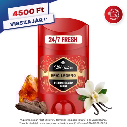 Élvezd az Old Spice Epic Legend stift dezodor nyújtotta, egész héten át tartó frissességet és magabiztosságot. Ha már eljutottál a frissességnek erre a fokára, végre fontosabb feladatokra koncentrálhatsz, például menő szerződéseket köthetsz, vagy beszélni taníthatod a halakat. Az erős hónaljszag elleni védelem érdekében vesd be az egyszerűen felvihető stift dezodort, amely nem hagy nyomot a ruhákon (az Old Spice deo sprayhez képest). Engedd szabadjára a 3x-os aktív védelmet: tartós illat, védelem a szagok ellen, szagmegszüntetés – így éjjel-nappal legendásan illatozhatsz.