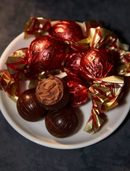 Svájci szarvasgombás szarvasgomba választékjuk dekadens választékot tartalmaz, beleértve a karamellizált cukorral ellátott fehér csokoládét, a gazdag tejet, az intenzív ét- és mogyorós csokoládé szarvasgombát. Minden egyedi csomagolású csokoládénak ellenállhatatlanul sima közepe van, amely egy igazán kényeztető csemegéhez készült.