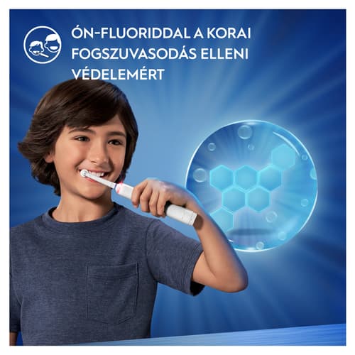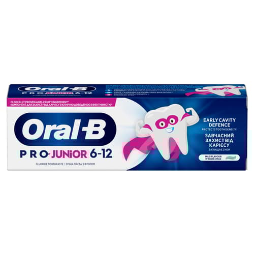 Az Oral-B Pro Junior fogkrém kifejezetten 6–12 éves gyermekek számára készül. A fogorvosok bevonásával kifejlesztett fogkrém védi a fogakat a mindennapos savhatásokkal és a cukorral szemben, így segít megelőzni a fogszuvasodást. Az enyhén mentolos ízesítésű fogkrém az életkornak megfelelő mennyiségű fluoridot tartalmaz, amely védi a fogzománcot. A klinikailag igazolt szuvasodás elleni összetevő, az ón-fluorid segít megelőzni a fogszuvasodást Védelmet nyújt a lepedékkel szemben és segít megelőzni a fogszuvasodást Segít megvédeni a fogzománcot a cukorral és a savhatásokkal szemben Védi a fogzománc anyagát, hogy a fogak tovább egészségesebbek maradjanak A fogorvosok közreműködésével kifejlesztett Oral-B Pro Junior fogkrém kifejezetten 6–12 éves gyermekek számára készül Gyerekfogkrém enyhén mentolos ízesítéssel