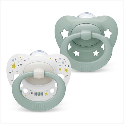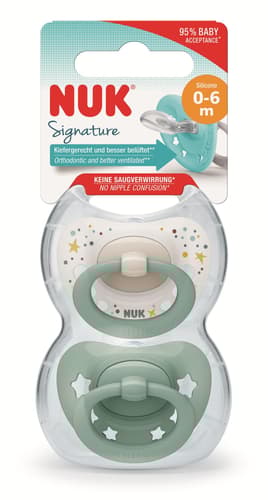 The NUK Signature is the most jaw-friendly NUK silicone pacifier to date, with an orthodontic shape for the healthy development of babies' mouths, tongues, and teeth. Thanks to its extra flat, thin, and narrow teat neck design, it perfectly fits the baby's small mouth and leaves enough space for the tongue for natural sucking movements. For this reason, infants and toddlers quickly and easily accept it. It is designed to mimic the mother's nipple during breastfeeding, which promotes healthy oral development. The famous heart-shaped shield of the popular NUK pacifiers has received an even smoother, softer shape in the Signature collection, and thanks to the ventilation holes, it ideally ensures air circulation. NUK pacifiers are 100% made in Germany. BPA-free. The correctness of this shape is recognized by 100% of orthodontic specialists, who confirm that NUK pacifiers do not cause tooth or jaw misalignments.