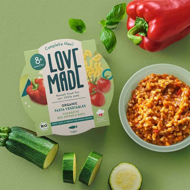 A LoveMade Organics zöldséges tészta ízletes cukkinivel, paprikával és bazsalikommal és sok-sok egészséges zöldség összetevővel ideális már 8 hónapos kortól. Az étel 100%-ban bio összetevők felhasználásával készült, míg a legkisebbek szármára izgalmas és élvezetes ízek kombinációját egy neves dán Michelin csillagos sztárséf fejlesztette ki.