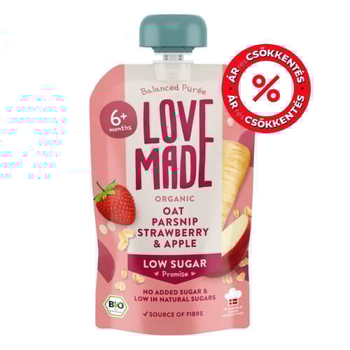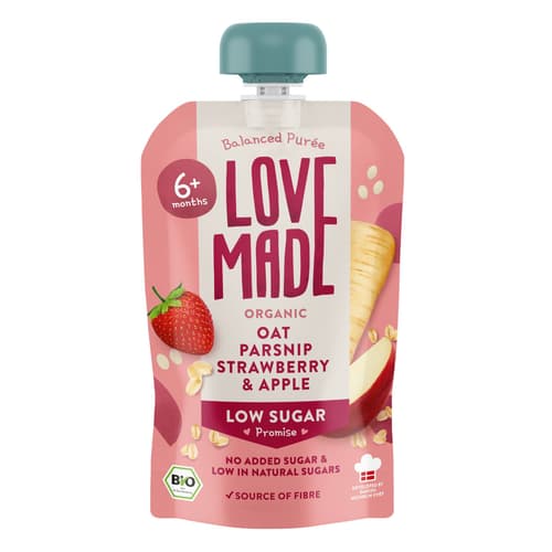 A LoveMade Organic zabkása bio paszternákkal, almával és eperrel egy csepp repceolaj hozzáadásával készült. Az ízek kombinációját egy neves dán Michelin csillagos sztárszakács fejlesztette ki. A tápláló zabkása kevesebb cukros gyümölcsöt és több zöldséget tartalmaz, így a természetes cukortartalom a lehető legalacsonyabb marad. Ideális snacknek napközbeni étkezésekhez és utazás közben is.