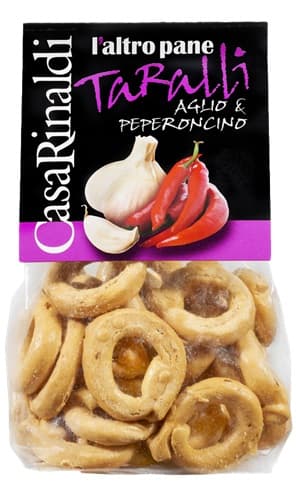 The garlic and chili pepper taralli are the latest addition to the Casa Rinaldi taralli family. Crispy, delicious, and enriched with the intense flavour of garlic and chili pepper, they are perfect snacks for lovers of strong flavours. They are also perfect bread substitutes, ideal with cold cuts, cheeses, and salads, as well as an aperitif and snack during and between meals.