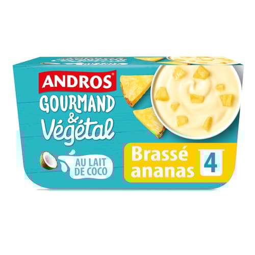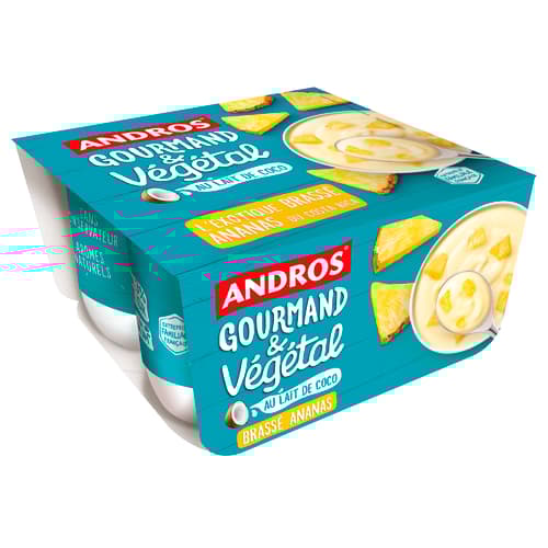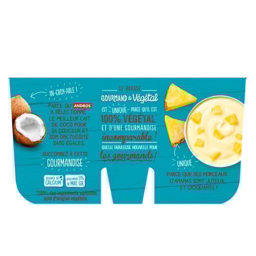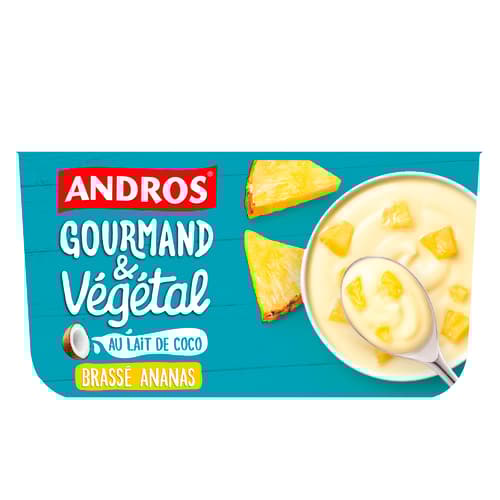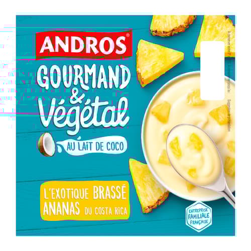 Az Andros Gourmandt & Végétal Ananász vegángurt egzotikus ízvilágával és természetes összetevőivel varázsolja el azokat, akik nemcsak finom, hanem tudatosan megválasztott növényi alapú desszertre vágynak. A trópusi, lédús ananászdarabok és a több mint 50% kókusztejet tartalmazó, krémes alap tökéletesen kiegészítik egymást, frissítően gyümölcsös élményt nyújtva minden kanálban.