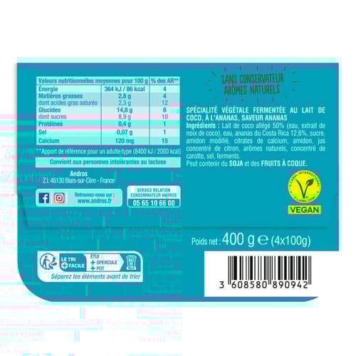 Mesterséges aromáktól, tartósítószerektől és állati eredetű összetevőktől mentes, ráadásul természetes kalciumforrás is – így ideális része lehet egy kiegyensúlyozott, növényi alapú étrendnek. Akár reggelire, akár napközbeni nassolásként fogyasztjuk, az Andros Gourmandt & Végétal Ananász vegángurt ízletes, frissítő kényeztetést nyújt minden alkalommal.