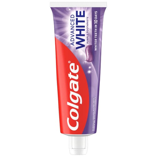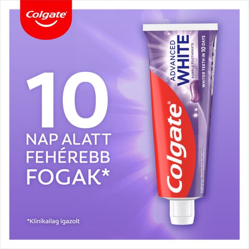 Élvezd a ragyogóbb, fehérebb mosolyt a Colgate® Advanced White Purple fogfehérítő fogkrémmel! Ez a lila fehérítő fogkrém élénk pigmentekkel és klinikailag igazolt fehérítővel segít hatékonyan eltávolítani a felszíni elszíneződéseket mindössze 10 nap alatt.*
