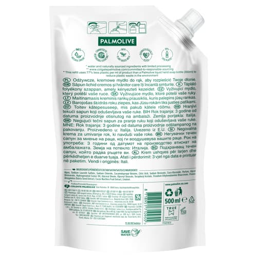 A folyékony szappan utántöltő nemcsak növényi alapú tejet tartalmaz, hanem 96%-ban természetes eredetű* összetevőkből készült és 98%-ban biológiailag lebomló** formulával rendelkezik. A folyékony szappan utántöltő csomagolása 77%-kal kevesebb műanyagot tartalmaz, mint egy 300ml-es Palmolive pumpás folyékony szappan flakon. Folyékony kézmosó szappan bőrgyógyászatilag tesztelt.