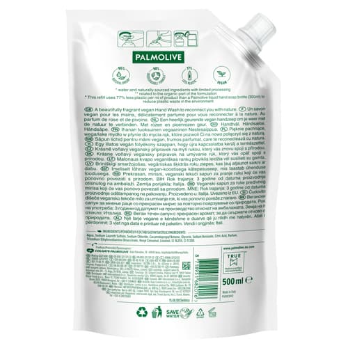 Ez a folyékony szappan utántöltő tasak segít védeni a környezetet, 77%-kal kevesebb műanyagot tartalmaz, mint a Palmolive pumpás folyékony szappan (300 ml).