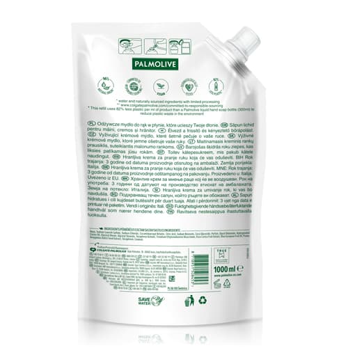 Palmolive "Milk & Olive" folyékony szappan utántöltő - tej proteint és olíva kivonatot tartalmaz. Bőrgyógyászatilag tesztelt. Ez a folyékony szappan utántöltő tasak segít védeni a környezetet, milliliterre vetítve 80%-kal kevesebb műanyagot tartalmaz, mint a Palmolive pumpás folyékony szappan (300 ml).