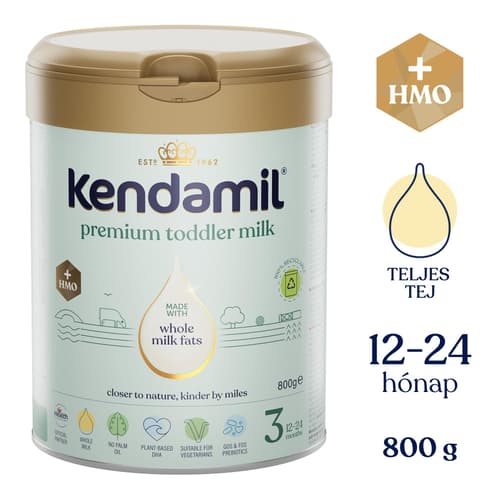 Tejalapú anyatej-kiegészítő tápszer por formájában. A 12. hónap végétől a 24. hónap végéig a gyermekek speciális táplálására szolgáló élelmiszer. Új, továbbfejlesztett tápszer anyatej oligoszacharid HMO-val (3'GL) és prebiotikumokkal (GOS és FOS), több mint 60 éves kutatás és fejlesztés alapján. A Kendamil Prémium tápszert a természet legjobbjai ihlették. Alapja elsősorban kiváló minőségű tehéntej, természetes tejzsírtartalommal, az anyatej mintájára. 12 hónapos és kétéves gyermekek számára készült.