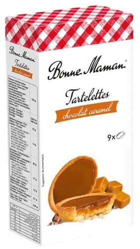 A Bonne Maman exklúzív francia desszert család emblematikus édességei a Tartelette-k. Az omlós tésztából készült kosárkák minőségi Karamell és Tejcsokoládé krémmel vannak töltve. A frissessége megőrzése érdekében a doboza 9 darab egyesével is csomagolt tortácskát tartalmaz. Tartósítószer és mesterséges színezékek nélkül készül.