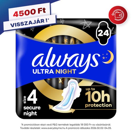 Ha nyugodt éjszakára vágysz, ne érd be kevesebbel az akár 10 órán át tartó védelemnél: A 4-es méretű ALWAYS Ultra Secure Night szárnyas egészségügyi betét nedvszívó és gyengéd fedőréteggel, valamint 3 védelemről gondoskodó termékjellemzővel rendelkezik, hogy ne kelljen az éjszaka közepén felkelned a szivárgás ellenőrzése vagy betétcsere miatt. A 60%-kal nagyobb hátsó rész (az 1-es méretű Always Ultra Normal betéthez képest) és a LeakGuard technológia kombinációja magába zárja a folyadékot, és segít megelőzni a szivárgást és a szagokat a menzesz éjszakái alatt. Az Always Ultra egészségügyi betétek a Skin Health Alliance bőrgyógyászati jóváhagyásával rendelkeznek.