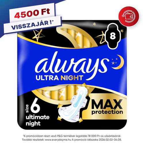Ha zavartalan éjszakai alvásra vágysz, ne érd be kevesebbel: A 6-os méretű ALWAYS Ultimate Night szárnyas egészségügyi betétet a MAXIMÁLIS VÉDELEM jegyében tervezték, hogy ne kelljen az éjszaka közepén felkelned a szivárgás ellenőrzése vagy betétcsere miatt. A leghosszabb és legszélesebb egészségügyi betétünk LeakGuard technológiával rendelkezik és 3-szor jobb a nedvszívó képessége (az Always Ultra Day Normal betéthez képest), így segít megelőzni az éjszakai szivárgást a menzesz időszakában. Az InstantDry rendszer másodpercek alatt felszívja a folyadékot, és a nedvességet távol tartja a bőrtől. A ComfortFit rendszer és a hátsó részen található extra szárnyak a helyén tartják a betétet, bármilyen pózban is alszol.