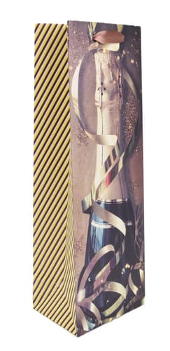 Ez a 12x36 cm-es boros ajándéktasak exkluzív pezsgős dizájnjával és díszszalag motívumával stílusos megoldást nyújt italos ajándékok csomagolására bármilyen alkalomra.