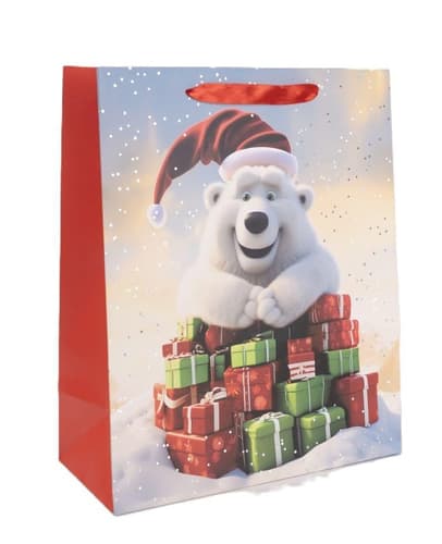 Vidám karácsonyi ajándéktasak jegesmedve mintával, havas, ünnepi hangulatban. Kiváló választás kisebb ajándékok csomagolásához.